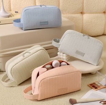 Yeni kişiselleştirilmiş yapışkan yazı makyaj çantası pembe çizgili taşınabilir kozmetik çantası büyük kapasiteli seyahat kabarık saklama yıkama torbaları